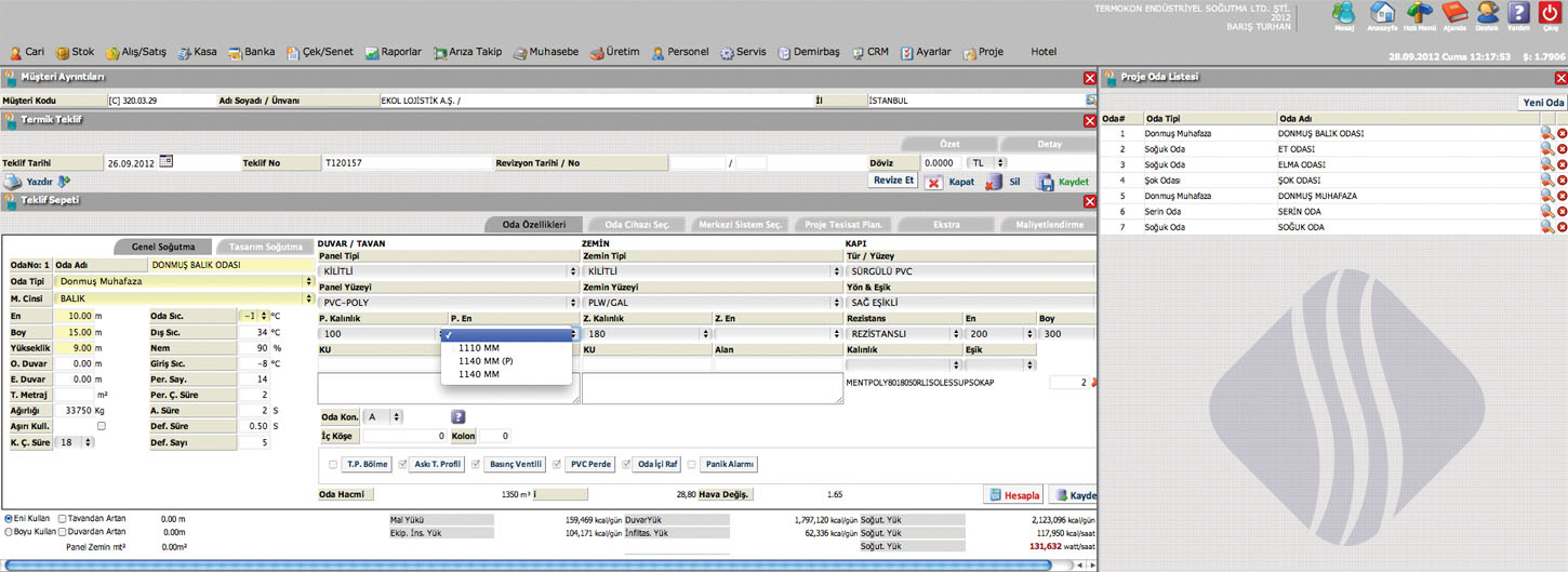 Profesyonel hizmet ve iş anlayışımızı kullandığımız teknolojilerlede göstererek bunu Termokon' a özel hazırlanmış yazılım ile desteklemekteyiz. Uzman mühendis kadromuzun tüm detaylı hesaplamaları yaparak alt yapısını kurup, yazılım ekibiyle ortak çalışmaları sonucu hazırladıkları teklif programı ile müşterilerimizin ihtiyaçlarına göre soğutma yükünü hesaplayarak, panel ve kapı gibi diğer bileşenleri de ekleyip iki dakika gibi kısa bir süre içerisinde teklif haline getirmekteyiz. Bu sayede müşterilerimizin taleplerine anında karşılık vererek müşteri memnuniyetine verdiğimiz önemi pekiştirmekteyiz. Yapılan bu özel yazılımın ERP sistemine entegre edilmesiyle sistemin izlenebilirliğinin en üst düzeyde olması sağlanmaktadır. Teklif aşamasından anahtar teslimine kadar daha da önemlisi tüm ürün ömrü boyunca bütün işlem, hesaplama ve takiplerin yapıldığı Termokon özel yazılımımızla sıfır hata, kusursuz hizmet ve mükemmel zamanlamayla hizmet vermekteyiz. |