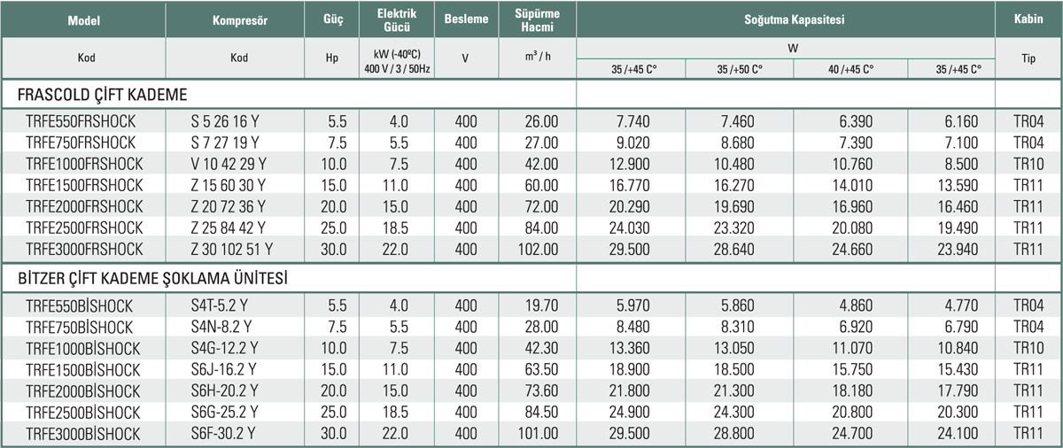 Karayel serisi cihazlar şoklama odalarında kullanılmak için uygun cihazlardır. Karayel serisi cihazların çalışma aralığı -35/-40 C'dir. Karayelşoklama cihazların kapasiteleri 5.970 watt ile 29.500 watt arasında değişmektedir. SİSTEM AVANTAJLARI • KULLANIM ALANLARINA VE STANDARTLARINA BAĞLI ÖZEL MODEL SEÇENEKLERİ • DIŞ ORTAMIN OLUMSUZ KOŞULLARINA DAYANIKLI KASA YAPISI • İHTİYACA BAĞLI ÜRÜN ÇEŞİTLİLİĞİ • YÜKSEK VERİM • DÜŞÜK SES SEVİYESİ • EKİPMAN KALİTESİ • ZEMİN YA DA DUVARA YERLEŞİM SEÇENEKLERİ • KURULUM BAKIM KOLAYLIĞI TEKNİK ÖZELLİKLER • TRİFAZE KOMPRESÖRLERDE KONTAKTÖR • 6 KUTUPLU FAN • ELEKTROSTATİK TOZ BOYALI ÇELİK GALVANİZ KABİN • BAKIR BORU ALÜMİNYUM LAMELLİ KONDENSER • KURUTUCU FİLTRE • SIVI HATTI ÜZERİNDE SERVİS VE BAKIM VANASI • RUTUBET KONTROLLÜ GAZ GÖSTERGESİ • TERMİK MANYETİK ŞALTER • ON-OFF ELEKTRONİK FAN KONTROL • KARTER ISITICISI • ALÇAK-YÜKSEK BASINÇ PRESOSTADI • LİKİT AKIŞ KONTROL SELENOİDİ • ALÇAK-YÜKSEK GERİLİM KORUMA RÖLESİ • SOĞUTUCU AKIŞKAN DEPOSU TEKNİK OPSİYONLAR • AKUSTİK SES İZOLASYONU • ELEKTRONİK FAN DEVİR KONTROLÜ