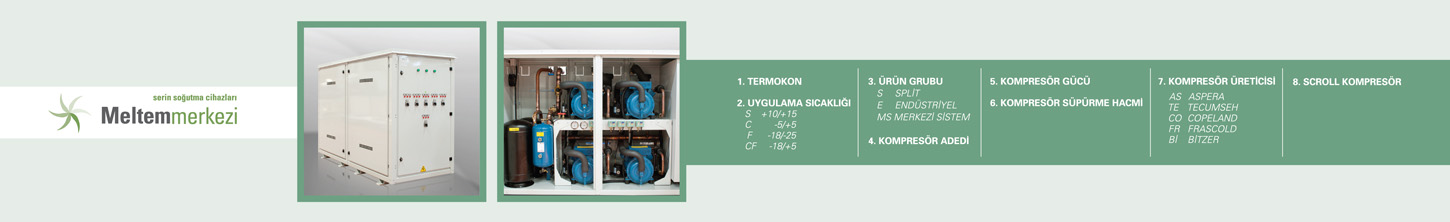 Meltem serisi cihazlar proses mahallerinde ve serin odalarda kullanılmak için uygun cihazlardır. Meltem serisi cihazların çalışma aralığı +10/+20 C'dir. Meltemmerkezi cihazların kapasiteleri 16.439 watt ile 454.048 watt arasında. SİSTEM AVANTAJLARI • KULLANIM ALANLARINA VE STANDARTLARINA BAĞLI ÖZEL MODEL SEÇENEKLERİ • DIŞ ORTAMIN OLUMSUZ KOŞULLARINA DAYANIKLI KASA YAPISI • İHTİYACA BAĞLI ÜRÜN ÇEŞİTLİLİĞİ • YÜKSEK VERİM • DÜŞÜK SES SEVİYESİ • EKİPMAN KALİTESİ • ZEMİN YA DA DUVARA YERLEŞİM SEÇENEKLERİ • KURULUM BAKIM KOLAYLIĞI TEKNİK ÖZELLİKLER • TRİFAZE KOMPRESÖRLERDE KONTAKTÖR • 6 KUTUPLU FAN • ELEKTROSTATİK TOZ BOYALI ÇELİK GALVANİZ KABİN • BAKIR BORU ALÜMİNYUM LAMELLİ KONDENSER • KURUTUCU FİLTRE • SIVI HATTI ÜZERİNDE SERVİS VE BAKIM VANASI • RUTUBET KONTROLLÜ GAZ GÖSTERGESİ • TERMİK MANYETİK ŞALTER • ON-OFF ELEKTRONİK FAN KONTROL • KARTER ISITICISI • ALÇAK-YÜKSEK BASINÇ PRESOSTADI • LİKİT AKIŞ KONTROL SELENOİDİ • ALÇAK-YÜKSEK GERİLİM KORUMA RÖLESİ • SOĞUTUCU AKIŞKAN DEPOSU TEKNİK OPSİYONLAR • AKUSTİK SES İZOLASYONU • ELEKTRONİK FAN DEVİR KONTROLÜ