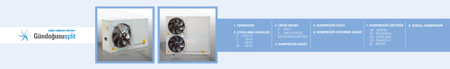Gündoğusu serisi cihazlar soğuk odalarda kullanılmak için uygun cihazlardır. Gündoğusu serisi cihazların çalışma aralığı -5/+5 C'dir. Gündoğususplit cihazların kapasiteleri 1.103 watt ile 11.508 watt arasında değişmektedir. SİSTEM AVANTAJLARI • KULLANIM ALANLARINA VE STANDARTLARINA BAĞLI ÖZEL MODEL SEÇENEKLERİ • DIŞ ORTAMIN OLUMSUZ KOŞULLARINA DAYANIKLI KASA YAPISI • İHTİYACA BAĞLI ÜRÜN ÇEŞİTLİLİĞİ • YÜKSEK VERİM • DÜŞÜK SES SEVİYESİ • EKİPMAN KALİTESİ • ZEMİN YA DA DUVARA YERLEŞİM SEÇENEKLERİ • KURULUM BAKIM KOLAYLIĞI TEKNİK ÖZELLİKLER • TRİFAZE KOMPRESÖRLERDE KONTAKTÖR • 6 KUTUPLU FAN • ELEKTROSTATİK TOZ BOYALI ÇELİK GALVANİZ KABİN • BAKIR BORU ALÜMİNYUM LAMELLİ KONDENSER • KURUTUCU FİLTRE • SIVI HATTI ÜZERİNDE SERVİS VE BAKIM VANASI • RUTUBET KONTROLLÜ GAZ GÖSTERGESİ • TERMİK MANYETİK ŞALTER • ON-OFF ELEKTRONİK FAN KONTROL • KARTER ISITICISI • ALÇAK-YÜKSEK BASINÇ PRESOSTADI • LİKİT AKIŞ KONTROL SELENOİDİ • ALÇAK-YÜKSEK GERİLİM KORUMA RÖLESİ • SOĞUTUCU AKIŞKAN DEPOSU TEKNİK OPSİYONLAR • AKUSTİK SES İZOLASYONU • ELEKTRONİK FAN DEVİR KONTROLÜ