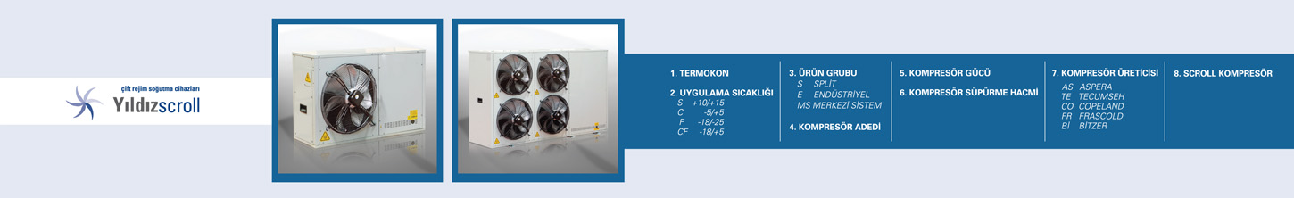 Yıldız serisi cihazlar ihtiyacınıza bağlı olarak soğuk odalarda ya da donmuş muhafaza odalarında kullanılmak için uygun cihazlardır. Yıldız serisi cihazların çalışma aralığı -18/0 C'dir. Yıldızsplit cihazların kapasiteleri 5.050 watt ile 21.700 watt arasında değişmektedir. SİSTEM AVANTAJLARI • KULLANIM ALANLARINA VE STANDARTLARINA BAĞLI ÖZEL MODEL SEÇENEKLERİ • DIŞ ORTAMIN OLUMSUZ KOŞULLARINA DAYANIKLI KASA YAPISI • İHTİYACA BAĞLI ÜRÜN ÇEŞİTLİLİĞİ • YÜKSEK VERİM • DÜŞÜK SES SEVİYESİ • EKİPMAN KALİTESİ • ZEMİN YA DA DUVARA YERLEŞİM SEÇENEKLERİ • KURULUM BAKIM KOLAYLIĞI TEKNİK ÖZELLİKLER • TRİFAZE KOMPRESÖRLERDE KONTAKTÖR • 6 KUTUPLU FAN • ELEKTROSTATİK TOZ BOYALI ÇELİK GALVANİZ KABİN • BAKIR BORU ALÜMİNYUM LAMELLİ KONDENSER • KURUTUCU FİLTRE • SIVI HATTI ÜZERİNDE SERVİS VE BAKIM VANASI • RUTUBET KONTROLLÜ GAZ GÖSTERGESİ • TERMİK MANYETİK ŞALTER • ON-OFF ELEKTRONİK FAN KONTROL • KARTER ISITICISI • ALÇAK-YÜKSEK BASINÇ PRESOSTADI • LİKİT AKIŞ KONTROL SELENOİDİ • ALÇAK-YÜKSEK GERİLİM KORUMA RÖLESİ • SOĞUTUCU AKIŞKAN DEPOSU TEKNİK OPSİYONLAR • AKUSTİK SES İZOLASYONU • ELEKTRONİK FAN DEVİR KONTROLÜ
